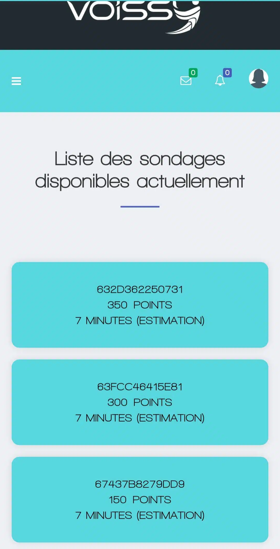 En échange de nos réponses aux sondages, Voissy reverse des Points. Ils sont ensuite convertibles en virement ou chèque cadeaux Amazon. Bien sûr, ils n’ont pas de valeur marchande avant d’être convertibles et vous ne pouvez pas les échanger avec un autre utilisateur.